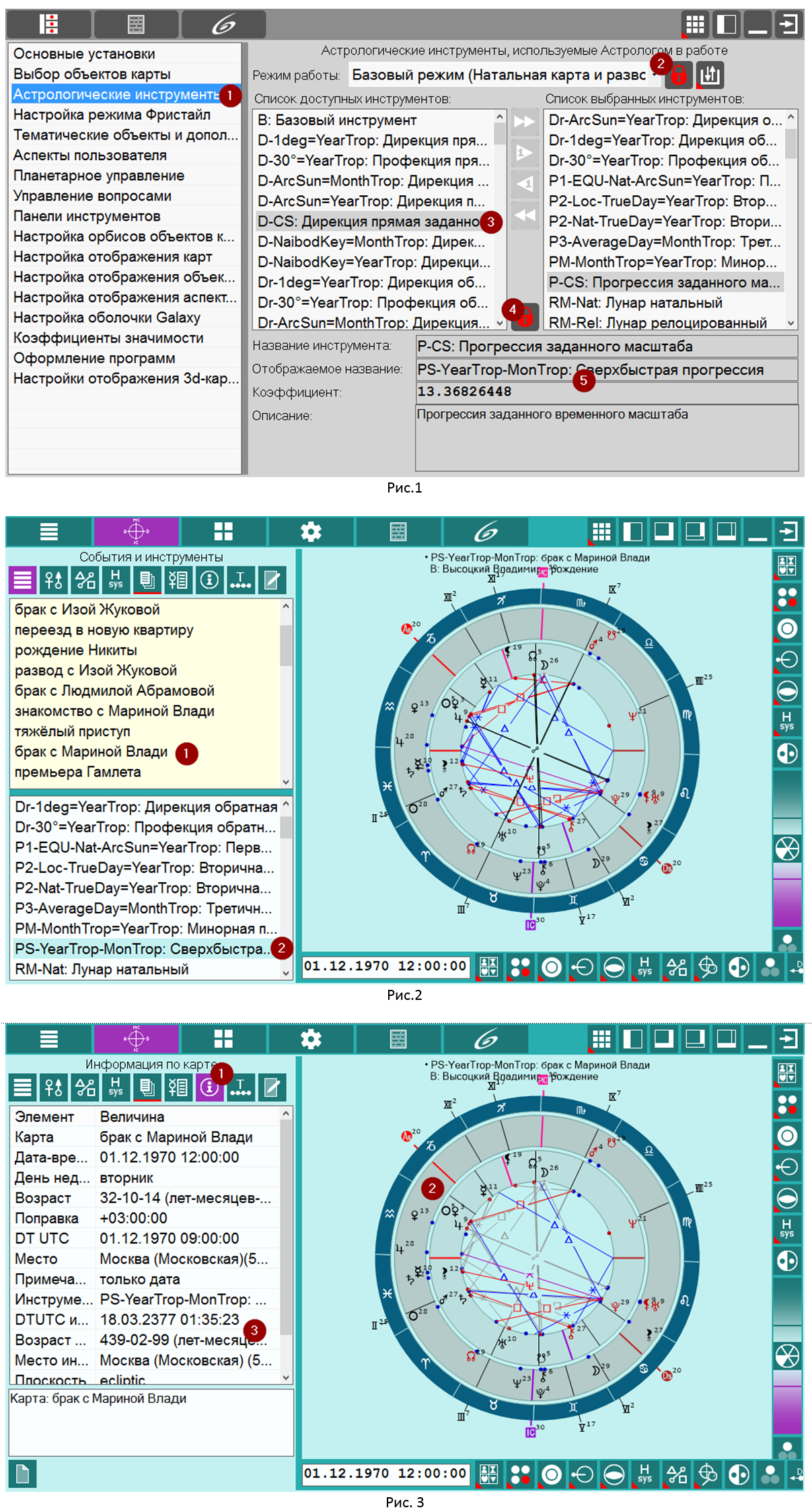Поищите в своей программе, как это делается. А как делается это в Galaxy разберём пошагово ниже. Там всё просто, и вы увидите, как на натальной карте Владимира Высоцкого, брак с Мариной Влади из 1 декабря 1970 года получается дата 18 марта 2377 года!!! Т.е. за время жизни Высоцкого до брака - 32 года 10 месяцев и 14 дней, сверхбыстрая прогрессия проходит более 439 лет!!!