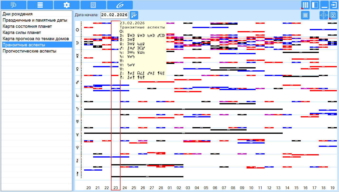 - рассчитывает транзитную обстановку на 28 дней от заданной даты и позволяет отображать аспекты между планетами в виде календаря и сквозного представления (графика);