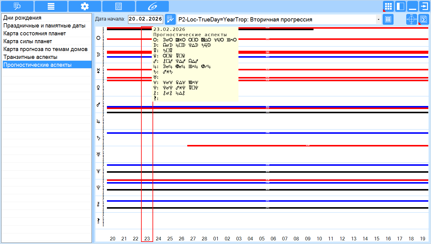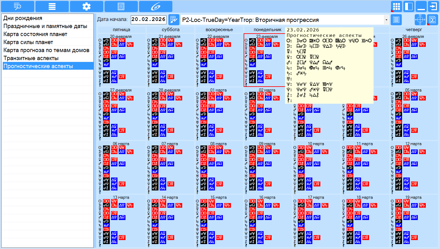 - рассчитывает прогностические аспекты для выбранных астрологических инструментов на 28 дней для привязанной натальной карты текущего (локального) места. И позволяет отображать аспекты между планетами в виде календаря и сквозного представления (графика) для выбранного астрологического инструмента.