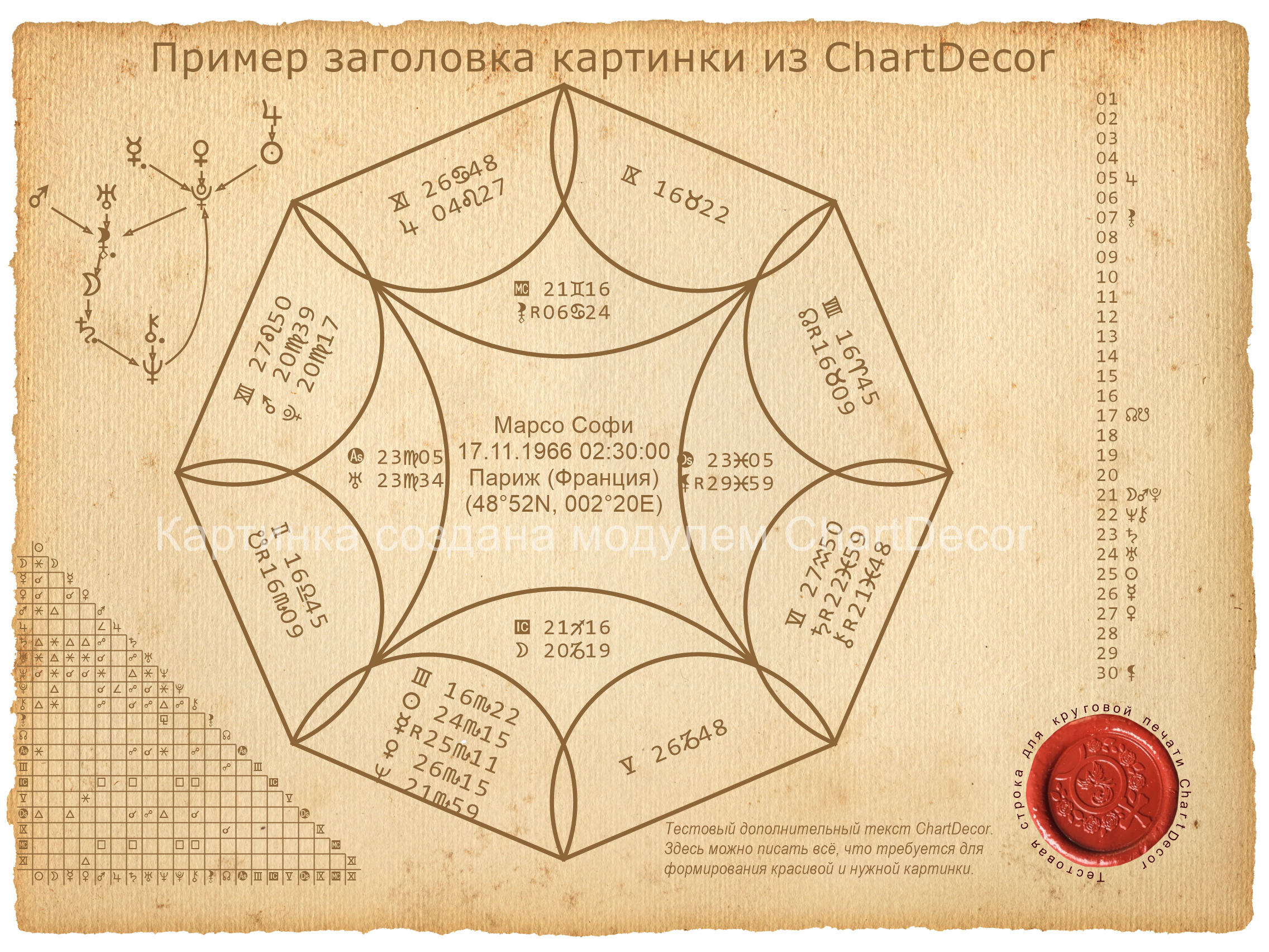 Модуль представляет собой специализированный графический редактор растровой и векторной графики с базами данных фоновых картинок, печатей и видов карт для декорирования астрологических карт. Под декорированием понимается "украшательство" и подготовка подарочных картинок с различными астрологическими видами карт (от раритетов до современных), таблицами аспектов, цепочками диспозиторов и тридцатиградусниками. Подготовленные картинки сохраняются в формате TIFF, что обеспечивает высокое качество файлов для последующей печати на больших листах бумаги. Смотрите скриншоты модуля ChartDecor.